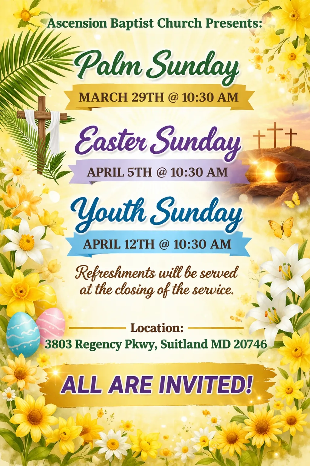 We are a small, family oriented church located at 3803 Regency Parkway, Ascension Baptist Church of Suitland, MD. We believe that you enter to Worship and Depart to serve.
